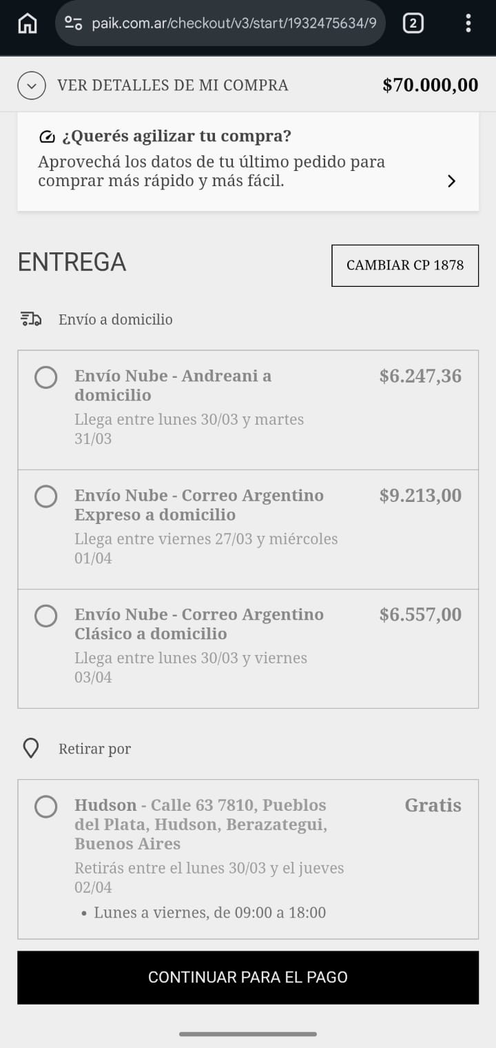 Especificá la dirección donde querés recibir el pedido o seleccioná la opción retiro gratis de la sucursal disponible. Elegí entre las opciones disponibles según la rapidez o el costo que prefieras y asegurate de que esté completa y correcta para evitar demoras. Después, presioná "Continuar".