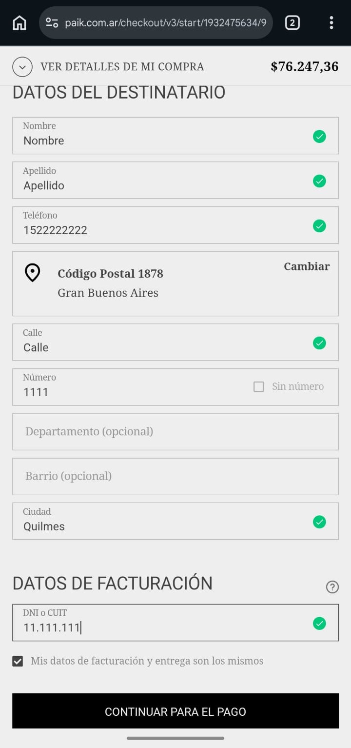 Completá los datos del destinatario y el número de documento de indentidad para que podamos emitir la factura correspondiente. Después, presioná "Continuar para el pago".